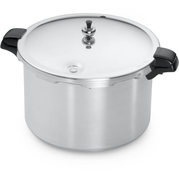 This 16-quart pressure canner is specifically designed to make home pressure canning easy and reliable. It follows the recommended safety guidelines of the U.S. Department of Agriculture for canning a variety of foods, including vegetables, meats, poultry, and seafood. Additionally, it serves as a boiling water canner, perfect for preserving fruits, jams, jellies, pickles, and salsa in half-pint and pint jars. Compatible with gas, electric, and smooth-top ranges, this canner features an adjustable regulator that automatically maintains pressure at 5, 10, or 15 pounds. Its unique air vent/cover lock system ensures that pressure builds only when the cover is closed properly, and it prevents the cover from being opened until the pressure has been safely reduced. The built-in visual indication of pressure provides added safety. This versatile product can also be used as a large capacity pressure cooker for preparing meats, poultry, soups, and desserts. Constructed from durable heavy-gauge aluminum, it offers longevity and even heating. The canner includes a cooking/canning rack and a comprehensive 76-page instruction/recipe book for canning and pressure cooking. It has a regular Mason jar capacity of 13 half-pints, 10 pints, or 7 quarts (boiling water processing limited to half-pints and pints). With an extended 12-year limited warranty, you can trust in the quality and performance of this pressure canner.