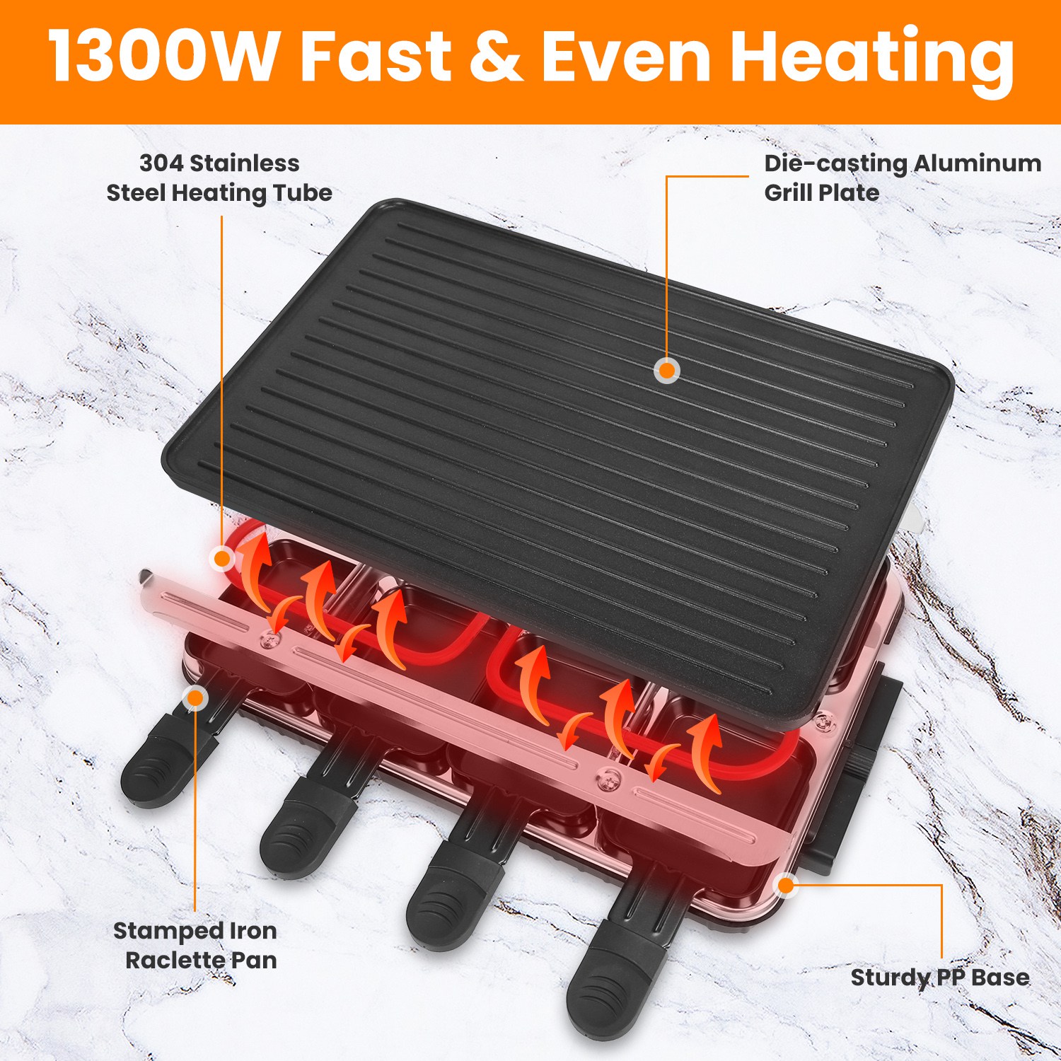Material: Die-casting Aluminum Grill Plate; Stamped Iron Raclette Pan; 304 Stainless Steel Heating Tube, PP Base, Stainless Steel Hardware, Wood Shovel